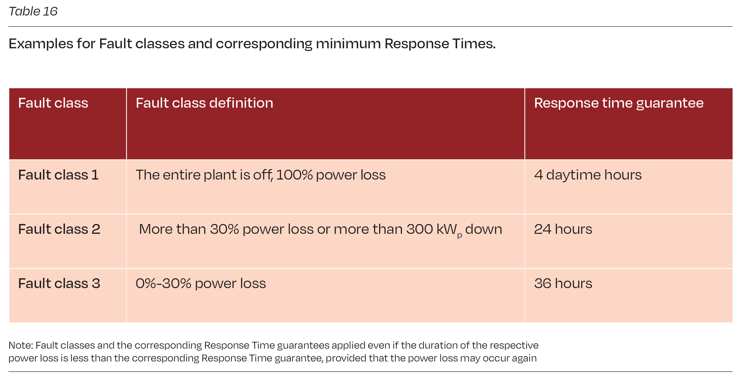 When setting a Response Time price adjustment, periods with high and low irradiance levels, and fault classes should be differentiated. This accounts for the (potential) loss of energy generation capacity or relevance in terms of safety impact of the failure.