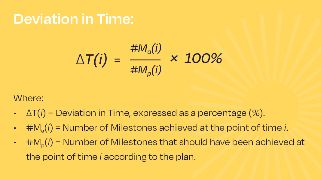 Milestones are used in project management to mark specific points along the project timeline. These points may signal anchors such as project start and end date, or the need for external review, input, and budget checks. Therefore, one important KPI concerning time is the Deviation in Time expressed as percentage of milestones missed:
