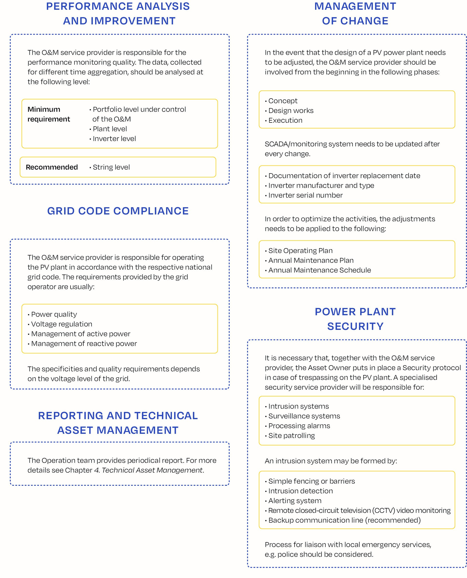 If the design of a solar PV power plant needs to be adjusted after the Commercial Operation Date, the O&M service provider should, as a best practice, be involved by the Asset Owner and the EPC service provider. They can even be a main contributor, if not the leader, of this change process. Reasons for such changes can be motivated by non-compliance of the solar PV power plant with the capacity predicted by the EPC service provider, by regulation change (introduction of new solar PV power plant controls regulations), by the unavailability of spare parts or components, or for an upgrade to the solar PV power plant. These events can trigger new design works, procurement and installation of new equipment and adjustment of O&M procedures and/or documentation. It may also impact certain performance commitments or warranties provided by the O&M service provider, which will need to be adjusted.