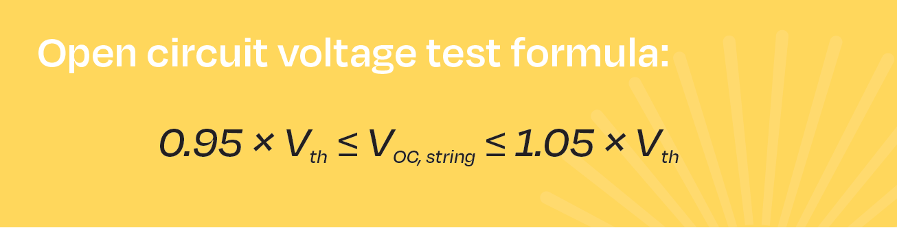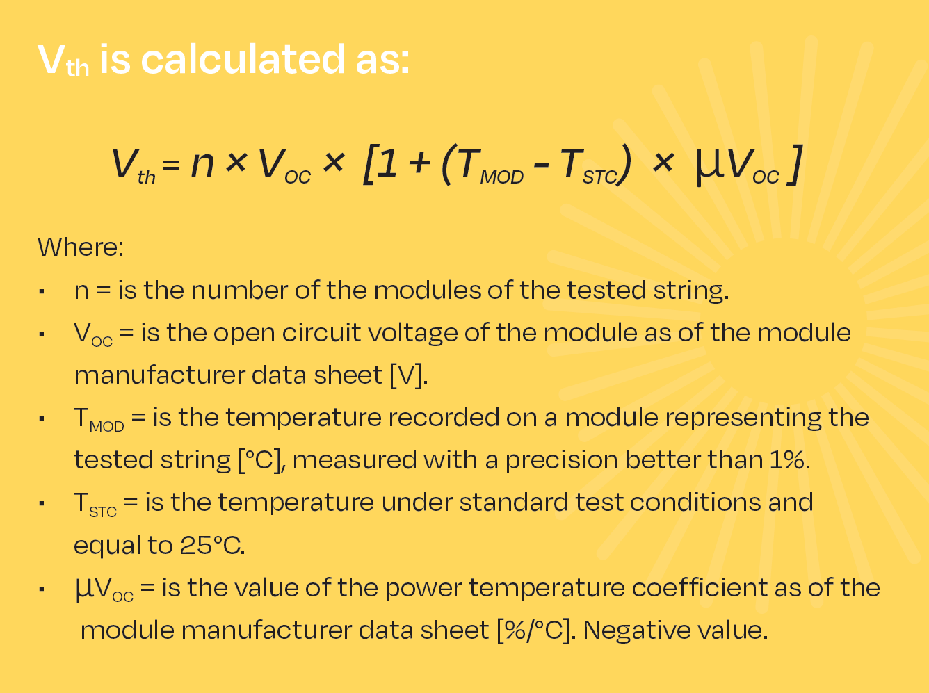 The VOC test is passed if all the VOC, string on the tested strings is within 5% of the expected value derived from the module datasheet. Note that most of the time, the theoretical value should be adjusted with the actual temperature recorded at the time of the measurements as it may be far from STC (25°C).