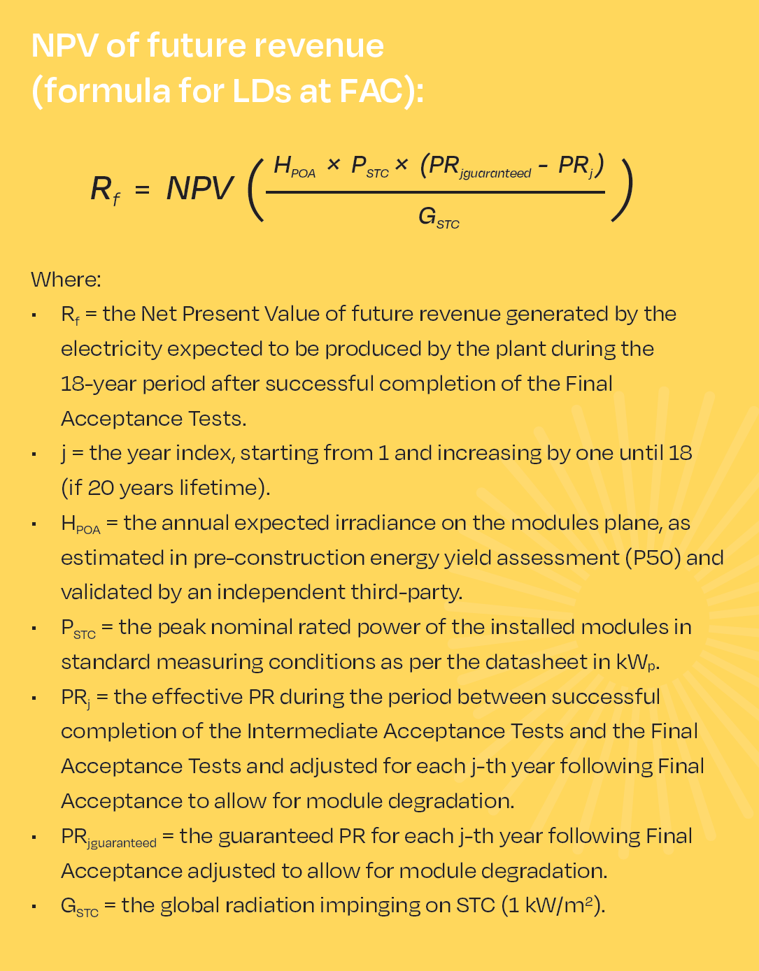 If the measured PR is below the guaranteed levels, the EPC service provider is required to pay performance Liquidates Damages (LDs) up to a certain amount (see chapter 12.5 Limitation of liability and Liquidated Damages) to the Owner for the compensation of revenue losses. During the Intermediate Acceptance phase, the LDs are based on the annual production shortfall and the electricity selling price of the PV plant. During the Final Acceptance phase, the LDs are also calibrated to reflect the loss of revenues that are expected for the full project lifetime or duration of the Power Purchase Agreement. This is usually calculated as the Net Present Value of future revenues shortfall linked to the PR shortfall. Below is an example formula for additional LDs at Final Acceptance: